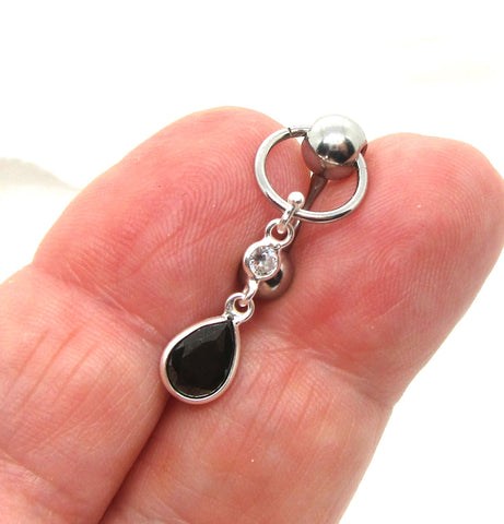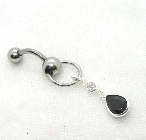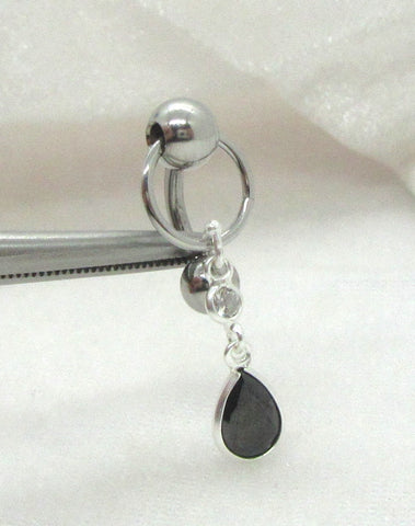This is a black crystal dangle belly ring with a 14g post/bar. The bar and hoop is made of surgical steel and the dangle is sterling silver. The top ball is 6mm and the bottom ball on the bar is 5mm.